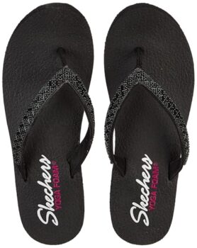 - Glam up in style this season wearing Skechers Cali Meditation. This casual vegan thong sandal features a three-point synthetic upper with black gem detail and a cushioned Yoga Foam comfort footbed.